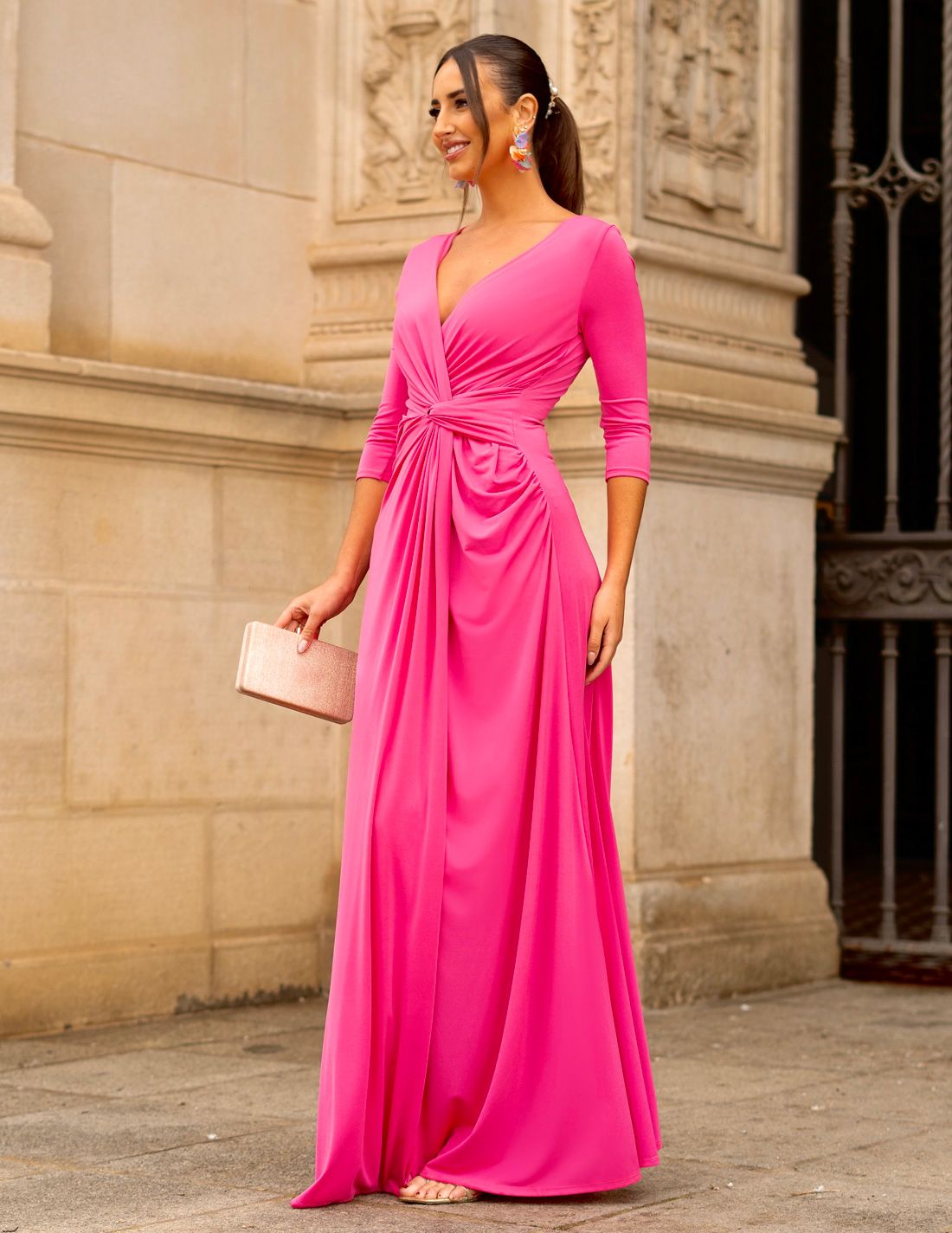 Con manga francesa, escote de pico, nudo entrelazado en la cintura y apertura infinita en la pierna, serás el centro de todas las miradas.